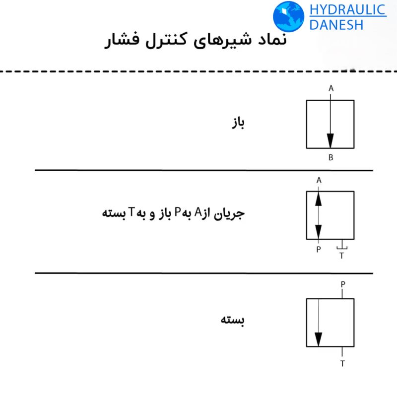 شیرهای کنترل فشار برای تنظیم فشار سیستم هیدرولیک طراحی شده اند و معمولاً با یک مربع به همراه فلش نشان داده می شوند که جهت جریان را مشخص می کند. شیرهای فشار ممکن است در وضعیت “نرمال باز” یا “نرمال بسته” باشند.