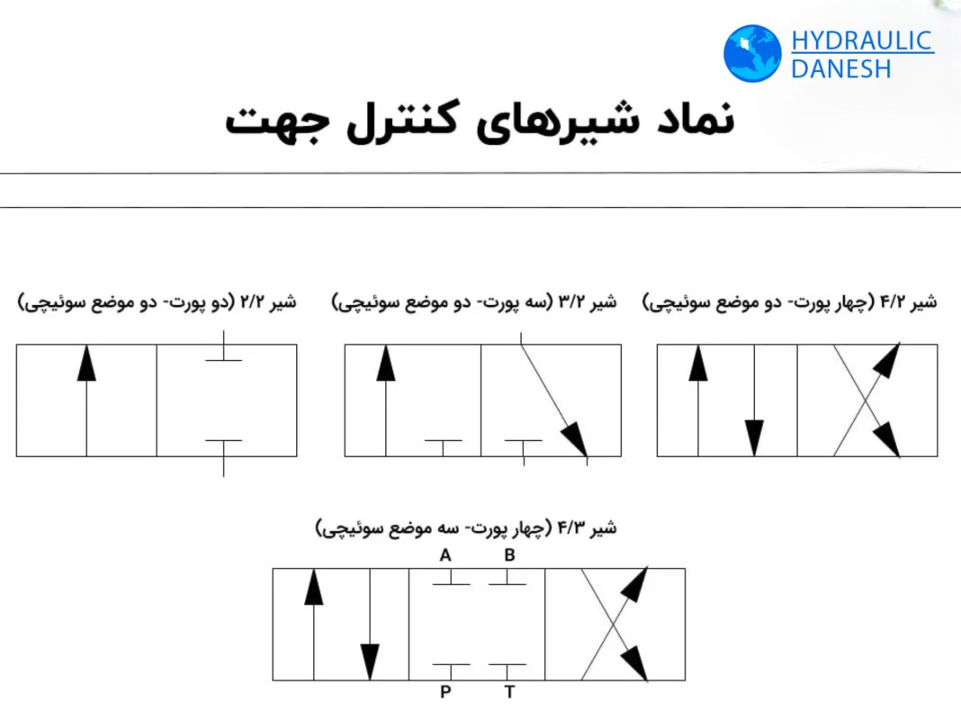 شیرهای کنترل جهت برای هدایت جریان روغن در سیستم های هیدرولیک استفاده می شوند. این شیرها معمولاً با نمادهایی که تعدادی مربع به هم متصل دارند، نشان داده می شوند. تعداد مربع ها نشان دهنده تعداد مواضع سوییچی شیر است، و داخل هر مربع، فلش هایی جهت جریان روغن را نشان می دهند.