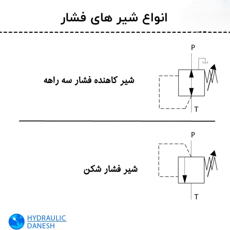 - شیرهای فشارشکن: این شیرها برای جلوگیری از افزایش فشار بیش از حد استفاده می شوند. در این نوع شیر فشارشکن هیدرولیک، فشار از ورودی پیلوت گرفته می شود و شیر در حالت نرمال بسته است.