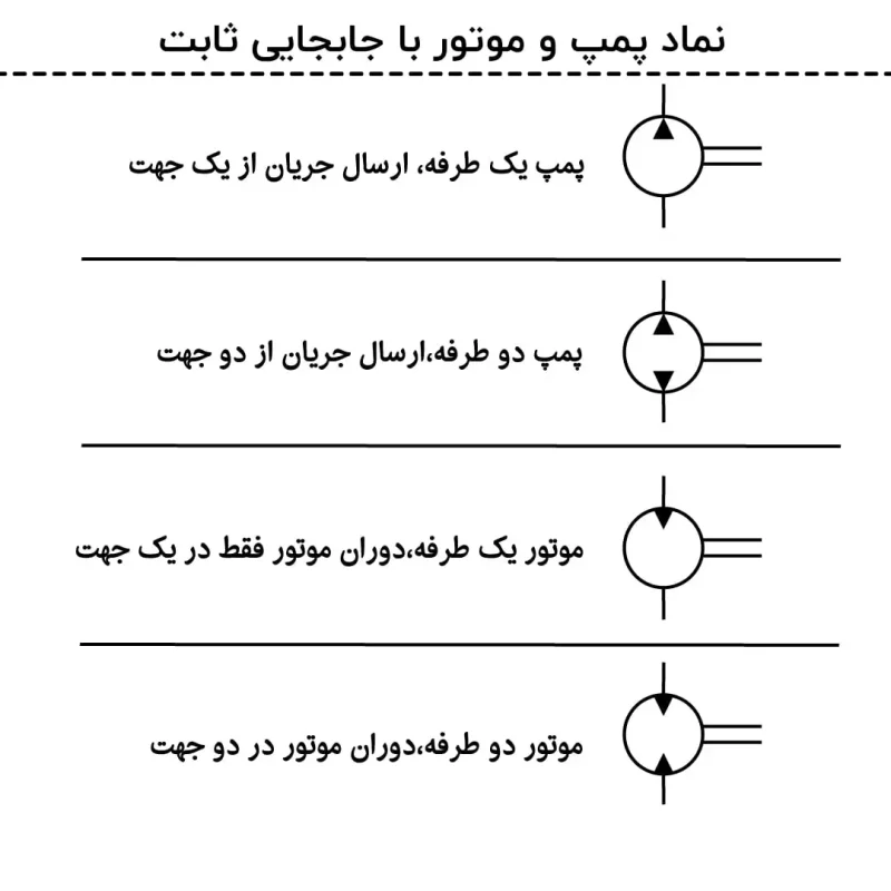 پمپ ها و موتورهای هیدرولیک یکی از اجزای اصلی سیستم هیدرولیک هستند که برای انتقال قدرت استفاده می شوند. این قطعات معمولاً با دایره هایی نمایش داده می شوند که شفت قدرت ورودی یا خروجی آنها با خطوط موازی کنار دایره نشان داده می شود. داخل دایره مثلث هایی قرار دارند که نشانگر جهت جریان روغن هستند. این مثلث ها معمولاً به صورت توپر کشیده می شوند و جهت آن ها از روی نوع قطعه فرق می کند. به عنوان مثال نماد پمپ پیستونی در هیدرولیک به طور معمول با یک دایره و مثلثی که جهت جریان را نشان می دهد، نمایش داده می شود. در این نماد، مثلث ها در پمپ ها به سمت خارج دایره قرار دارند که نشان دهنده ارسال جریان در یک جهت است.